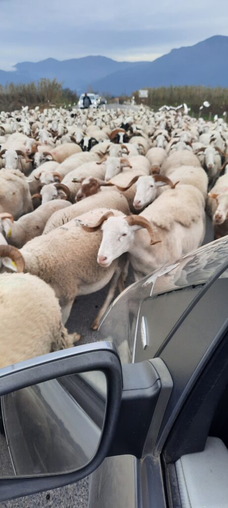 En voiture un dimanche sur la route du retour au loin une vague laineuse avait pris la route d’assaut. elles allaient d’un pas régulier en direction d’un nouveau pré. behhhhh à tue tête et de leur plus joli timbre elles chantonnaient pour se donner de l’élan encourageant les plus jeunes ou pestant après les chiens. Le sifflet du berger, les aboiements et leur petits sabots cliquetant sur l’asphalte m’offraient un des plus jolis cadeaux à vivre à ce moment là. A l’arrêt je laissais ces dames et sieurs m’entourer et poursuivre leur périple des plus joyeux. Le bonheur de le vivre la chance de l’ instand un cadeau de la vie devant moi la chaine des Pyrénnées un dimanche midi un moment de rêve.