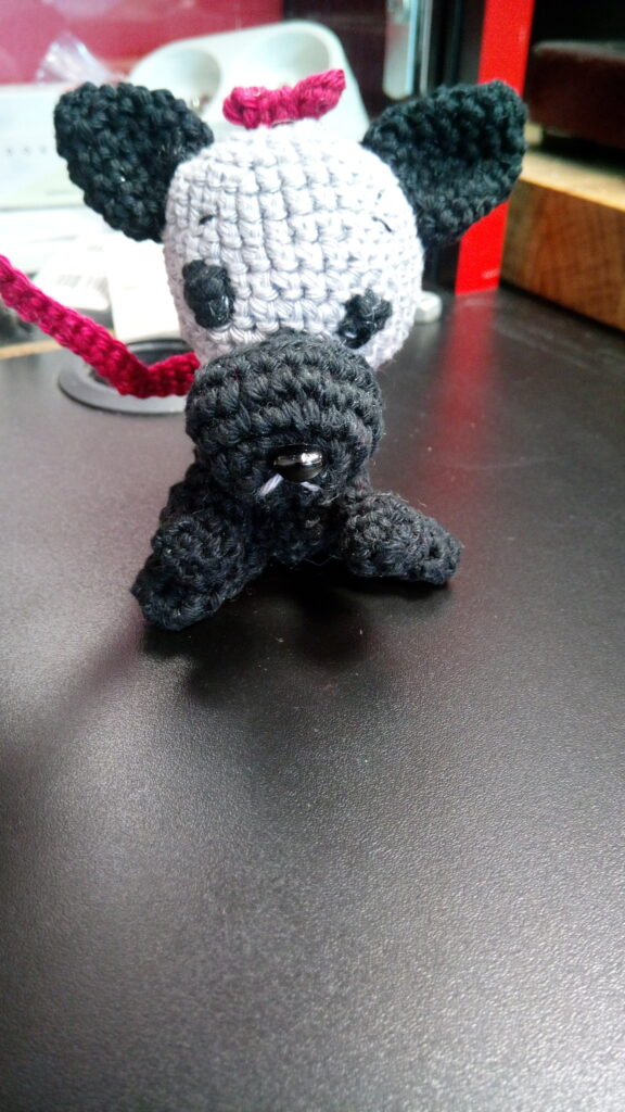 Ma deuxième poupette crochetée en fils de coton et crochet numéro 2. Premier essai de cheveux synthétiques commandés sur ali express. je les ai choisis roux et mi longs. Une technique de couture en rond de la base de la tête jusqu’au sommet du crane. Moment d’attention pour un résultat qui m’a satisfaite. Il me restait le regard qui n’est pas une mince affaire. J’ai choisi du coton perlé violet pour broder les yeux et la bouche et le détail des cils synthétiques pour les finitions. Un fil après l’autre en ourlant de noir le contour de l’œil au violet de l’iris quelques points blancs et une pupille noire dirigée et voila que la vie apparait enfin.