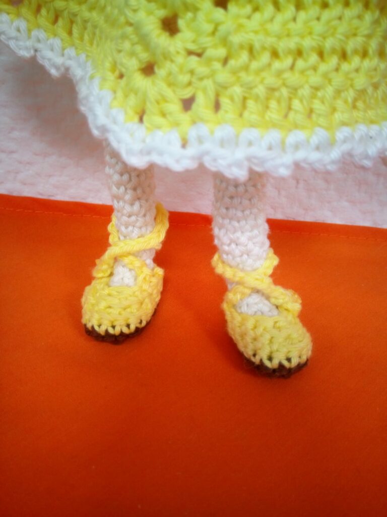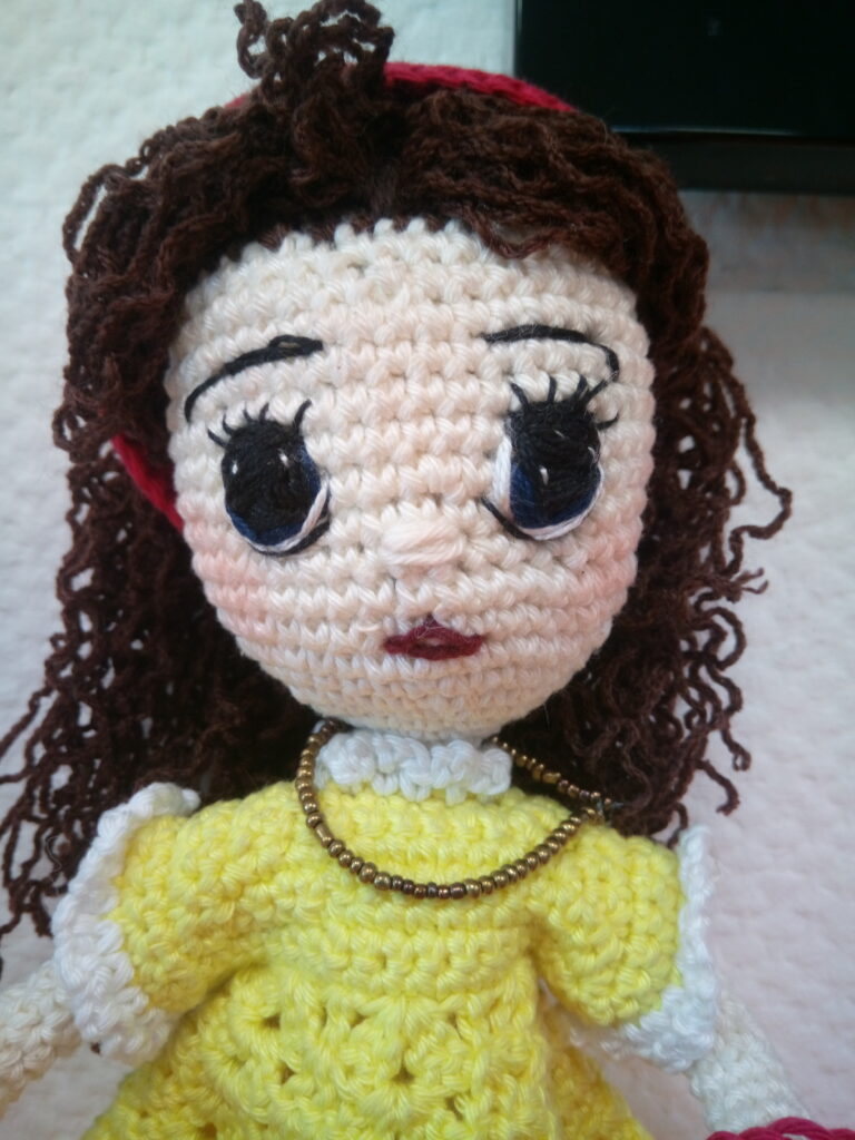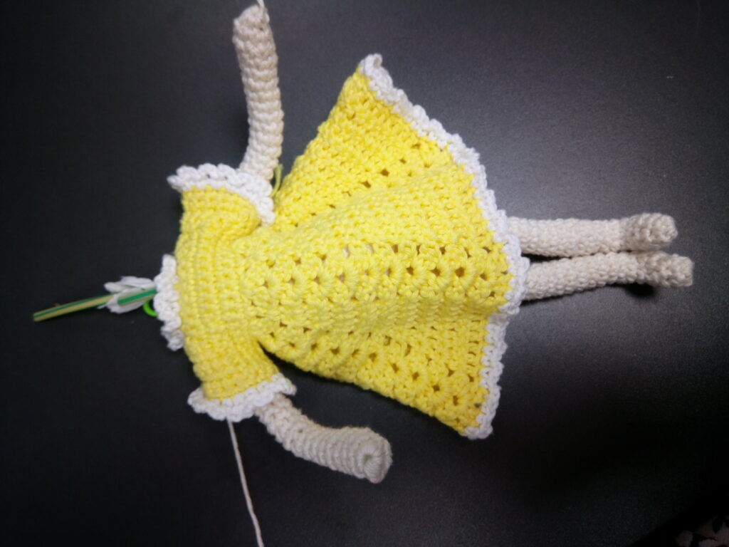 Mais si vous saviez combien je me suis amusée tout en étant concentrée. J’aime tellement le monde des poupées que leur donner vie est un plaisir très réconfortant. D’abord on commence par crocheter en mailles serrees le pied et on monte doucement une jambe en augmentant les mailles a chaque tour puis un autre pied un genou une cuisse et le corps jusqu’au bras. Je l’ai renforcée à l’intérieur avec du cable pour la stature droite un bras et puis le deuxième et la tête et la tête alouette … oh lala une fois terminée il faut broder les yeux et le nez puis la bouche j’étais confiante j’ai pris le temps et la voila. De jolis yeux bleus des restes de laine ondulées pour les cheveux. Le plaisir décuplé à l’arrivée. Doucement elle prenait vie entre mes mains. Je suis attachée à mes créations je le dis parce qu’elles sont uniques chacune. Je lui ai faite une jolie robe jaune que j’ai trouvée sur le site de Petus ochoa la reine des poupées crochetées au Brésil Sans prétention je suis mais j’aime .ma poupée Mellie. si ça vous dit d’apprendre suivez les tutos de Petus Ochoa ou d autres créateur comme Sandra Muller