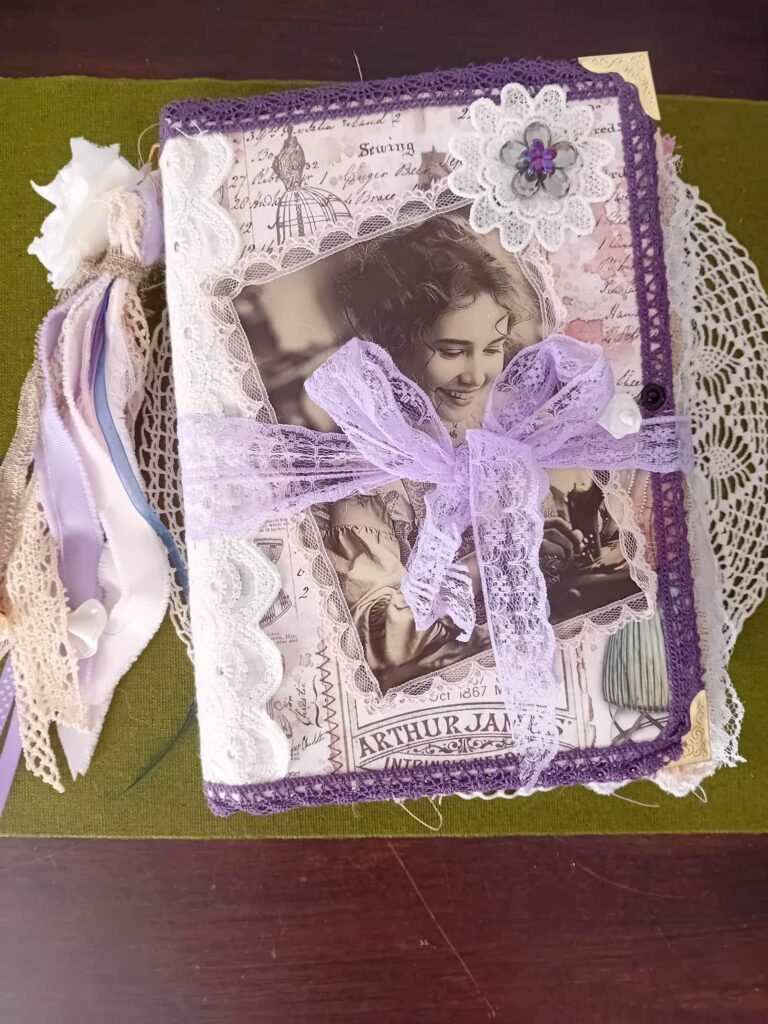 enfin presque terminé mon projet Junck journal je décide de vous le partager en ce début Novembre. Un grand plaisir qui me tardait de commencer …. J’avais hâte d’organiser ma couverture et embellir mes pages avec mes rubans et dentelles. oui c bien de collectionner les dentelles mais les les mettre en scène c un vrai travail de couturière … le papier teinté à l’avocat un plaisir de la magie en cuisine pour un résultat bluffant que je voulais tester.